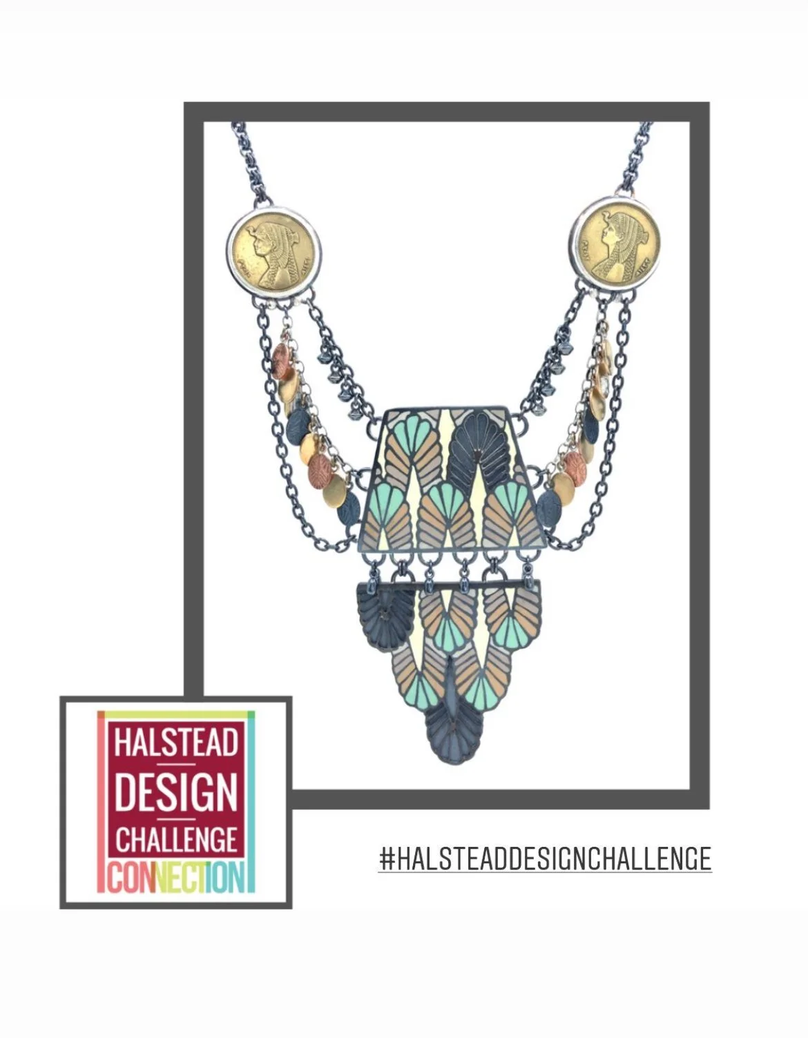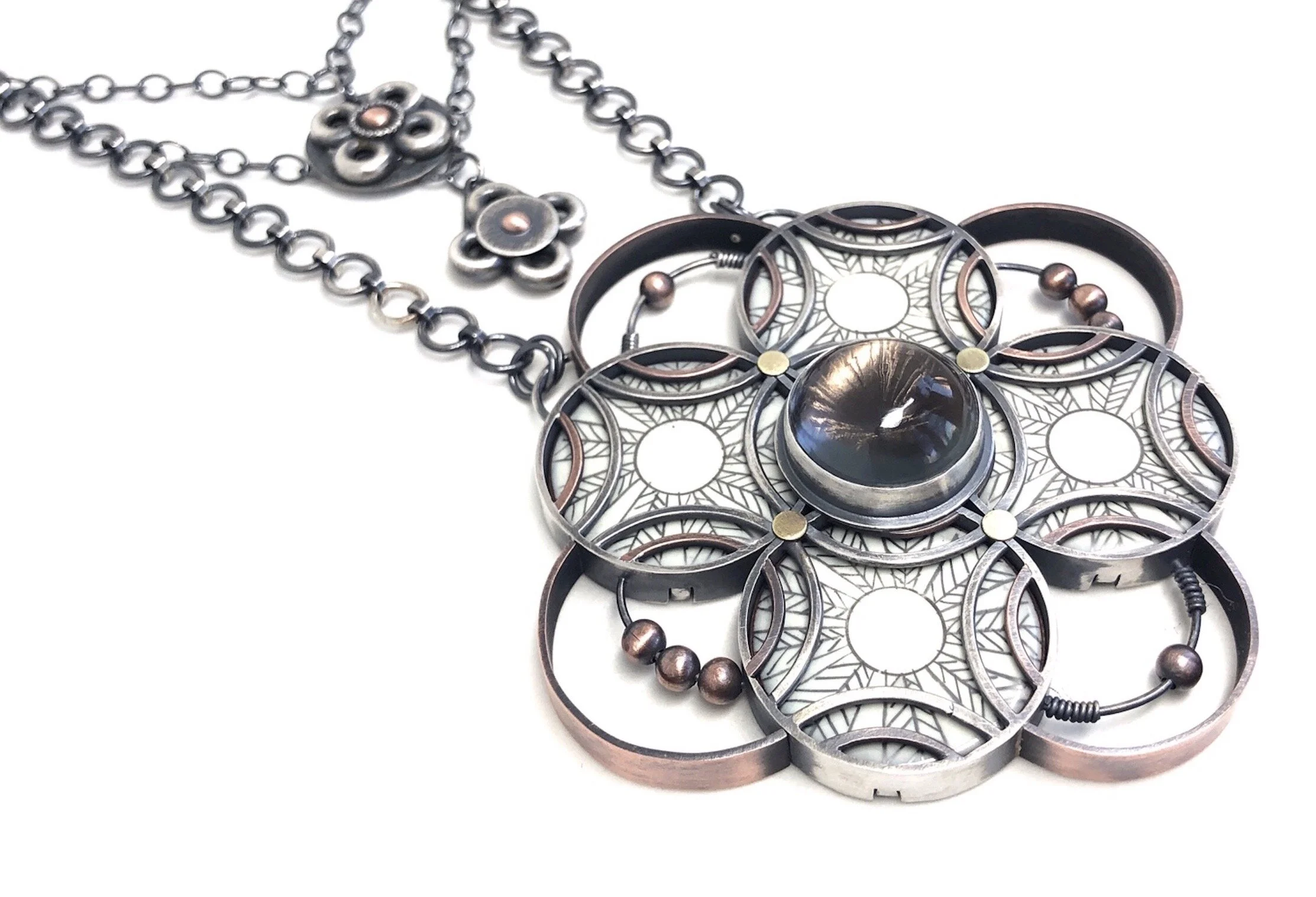Renewal (2019) What was once old is new again. Recycled television glass, and a lattice motif weave a hopeful story of renewal. The lattice pattern is a snapshot of a series of cycles in perpetual motion. Kinetic elements in the form of copper beads create a sense of flow and moving forward. The recycled glass sits upon a textured copper disc transforming it into a rutilated gem. Enameled components marked with graphite complete this tale of revival.